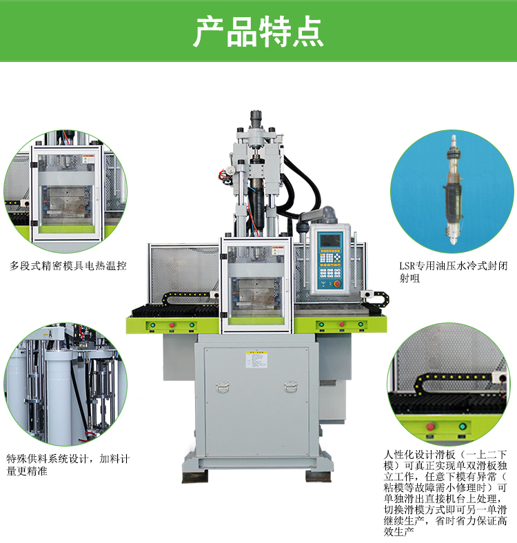 ●標準120噸鎖模力;  ● 特種給料擠出設計制作,放料劑量招商精準,擠出不穩;  ● 多段式精密儀器合金模具電暖溫控儀;  ● LSR專業氣動系統自封散熱式全封射咀狠抓永無漏膠;  ● 雙長板設計的(一上二下模),取放件更方面,更可 利用率LSR熱固成品時的停頓時段,讓操控員做另 一模 取/放及進行清潔磨具工作任務,遠遠升級的生產工作效率;